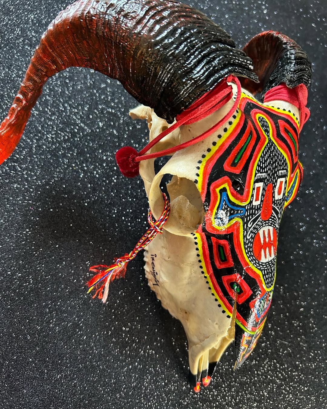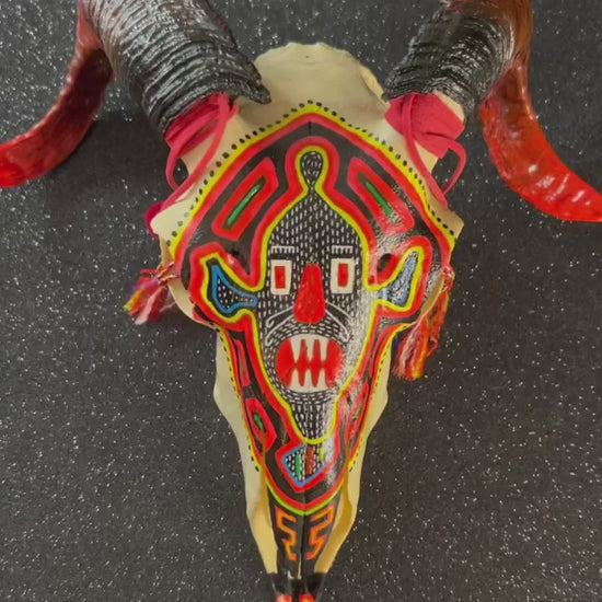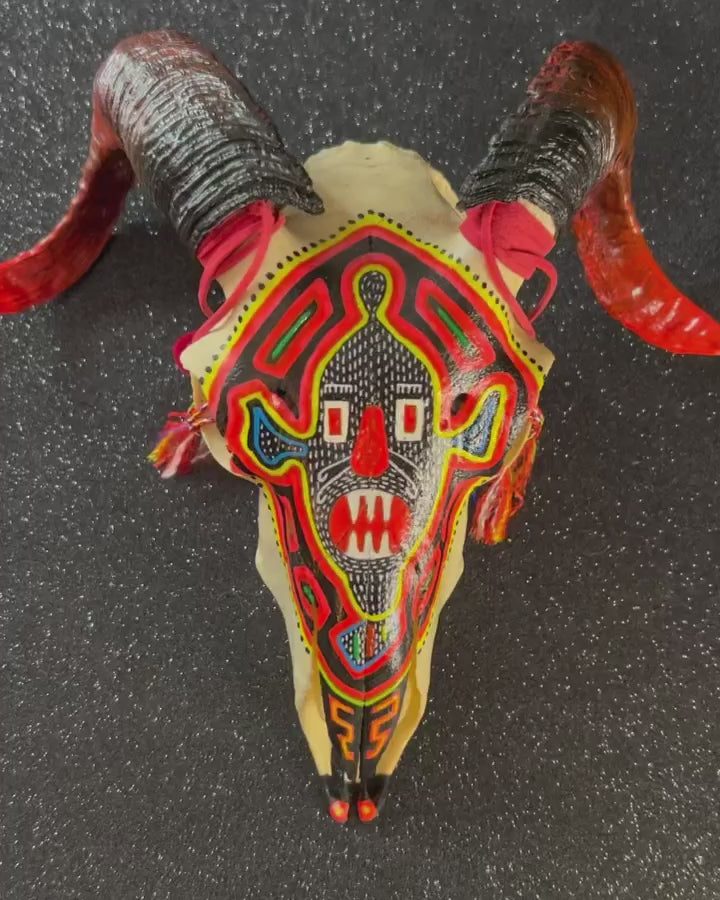 Cráneo de Carnero decorado con acrílicos. Formato 26 x 23x 11 cms.